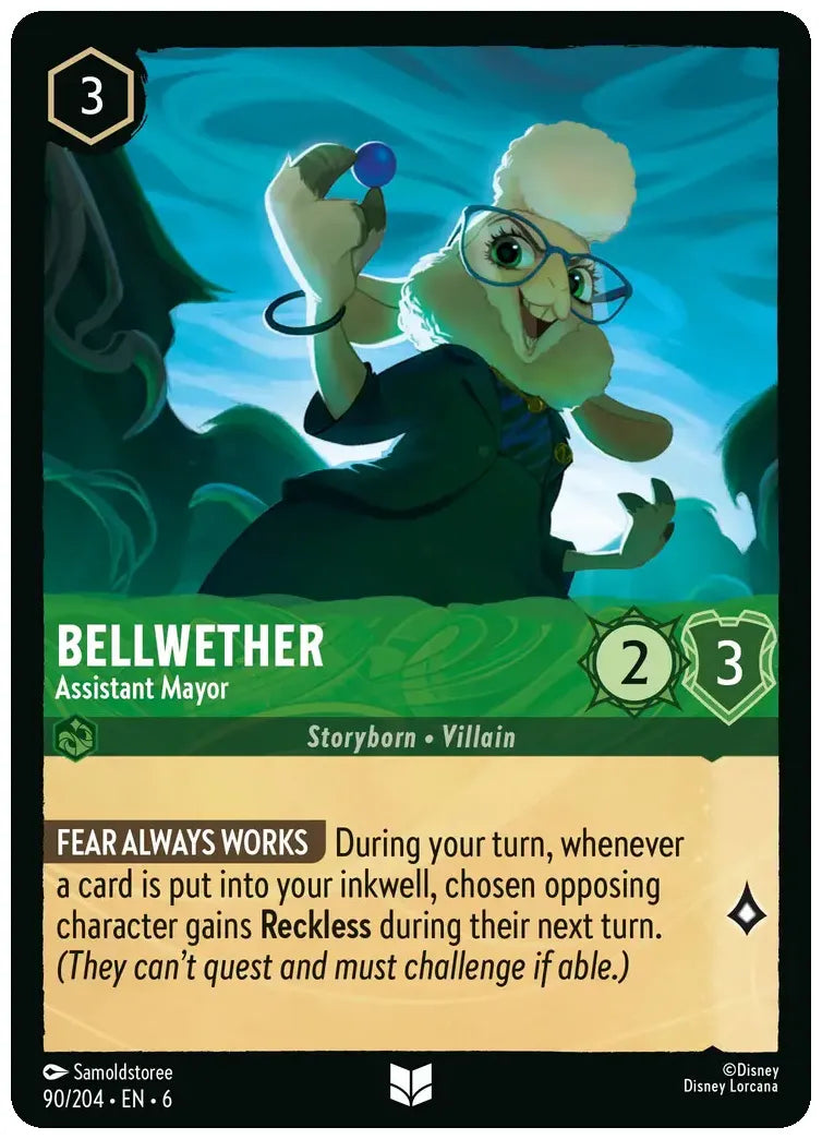 During your turn, whenever a card is put into your inkwell, chosen opposing character gains Reckless during their next turn. (They can't quest and must challenge if able.)