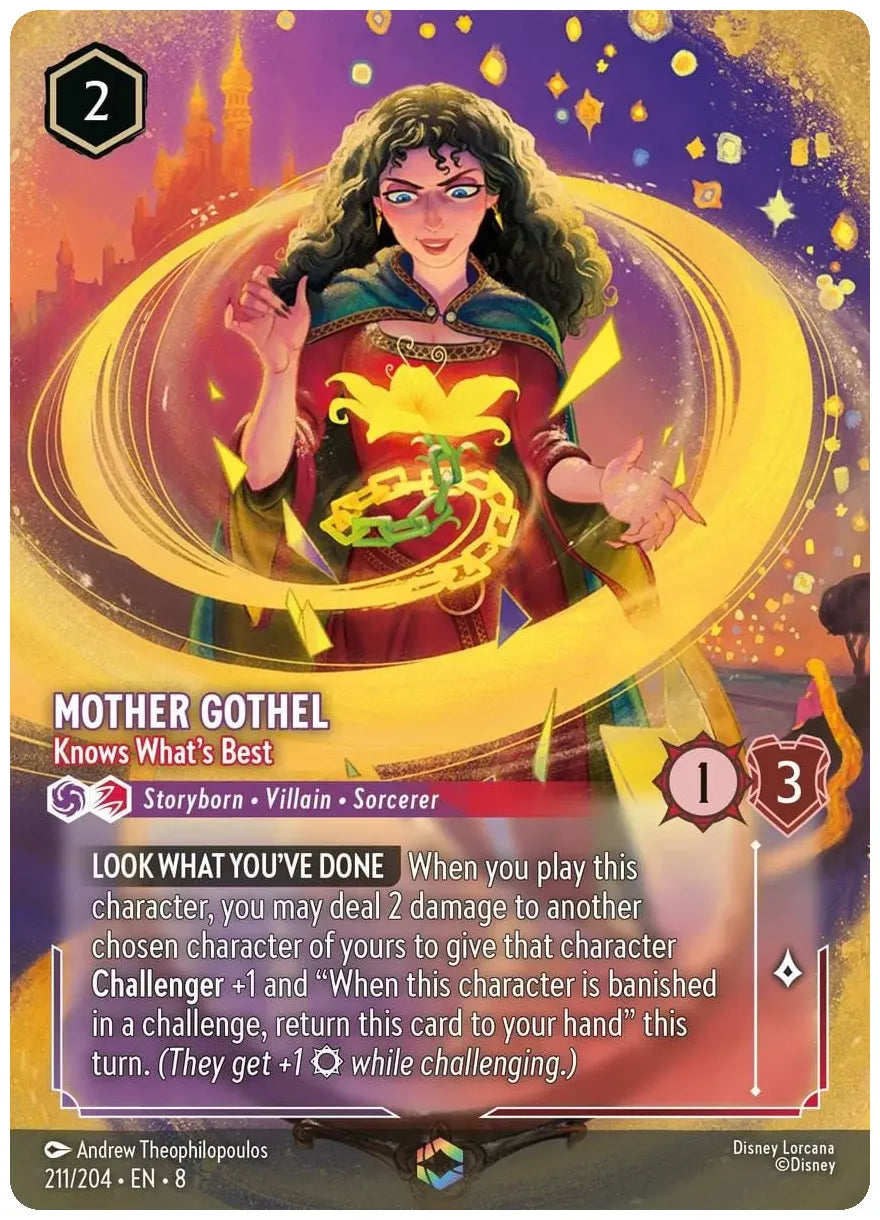 When you play this character, you may deal 2 damage to another chosen character of yours to give that character Challenger +1 and “When this character is banished in a challenge, return this card to your hand” this turn. (They get +1 while challenging.)
