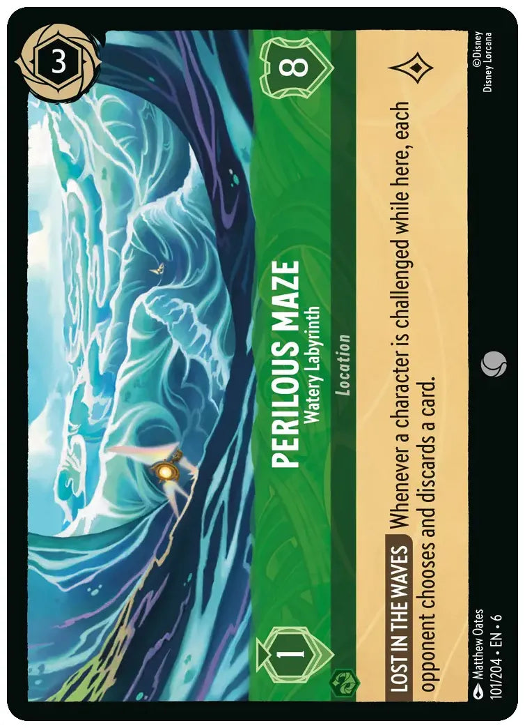Whenever a character is challenged while here, each opponent chooses and discards a card.