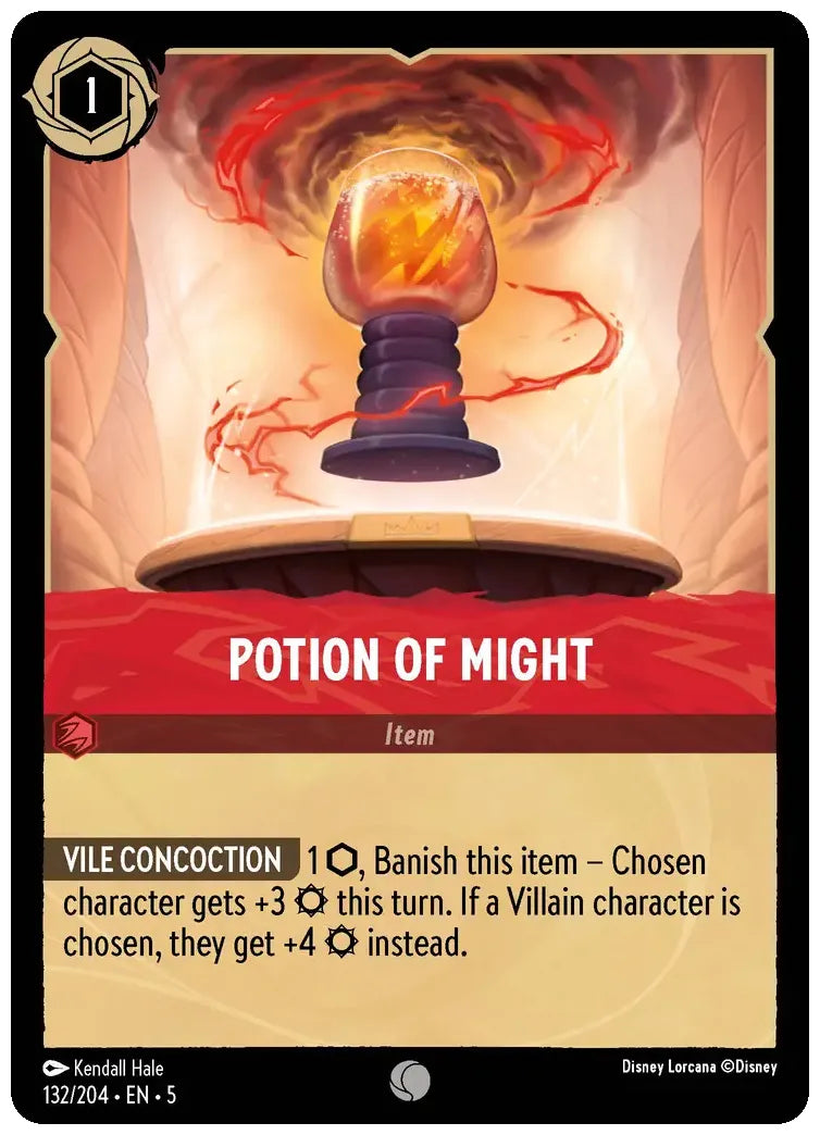 1 ink, Banish this item – Chosen character gets +3 strength this turn. If a Villain character is chosen, they get +4 strength instead.
