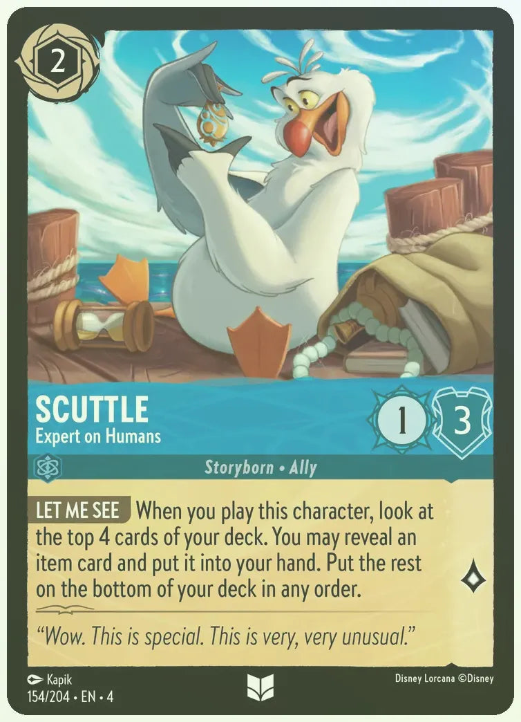 When you play this character, look at the top 4 cards of your deck. You may reveal an item card and put it in your hand. Put the rest on the bottom of your deck in any order.