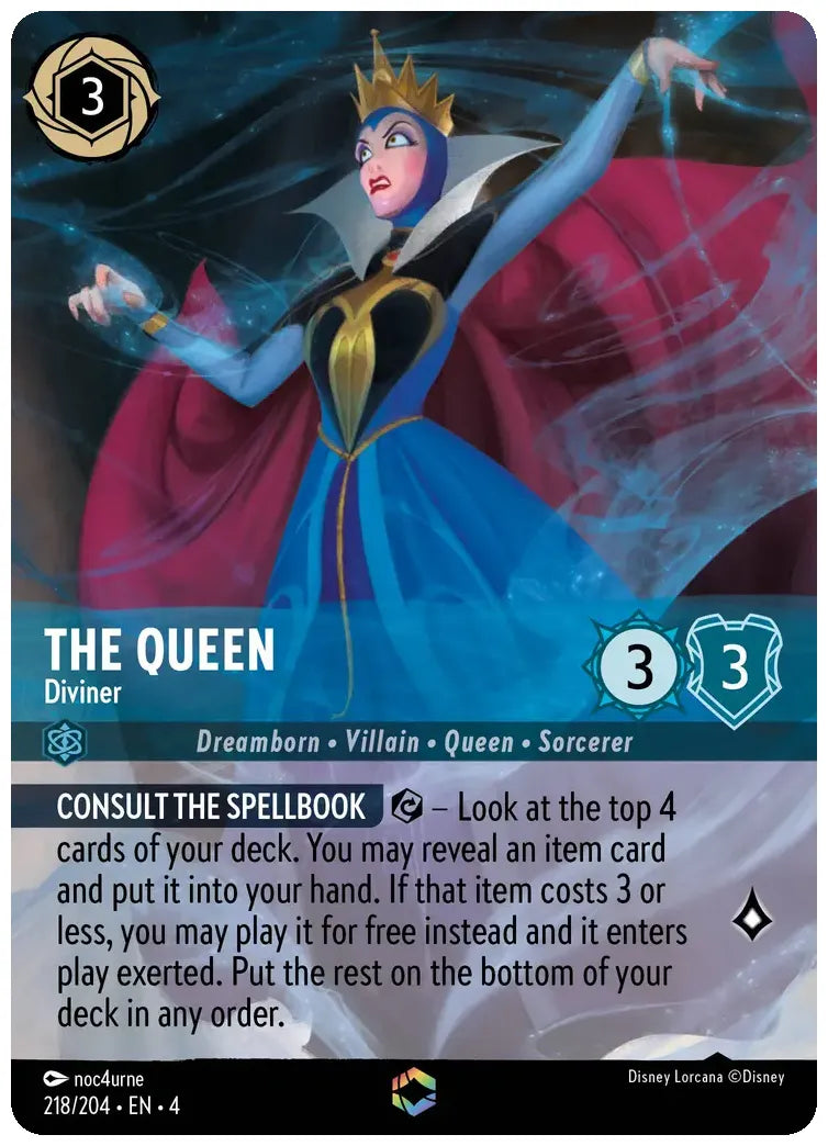 Exert – Look at the top 4 cards of your deck. You may reveal an item card and put it into your hand. If that item card costs 3 or less, you may play it for free and it enters play exerted. Put the rest on the bottom of your deck in any order.